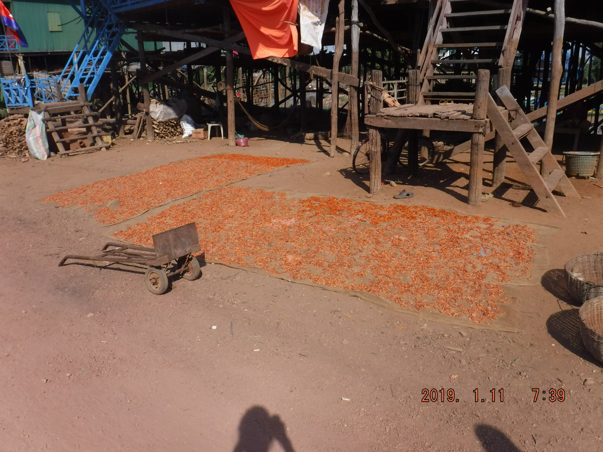 Few vehicles were present and he kids were having a ball running around playing football. Along the sand track they were drying shrimp that they had caught from the river.