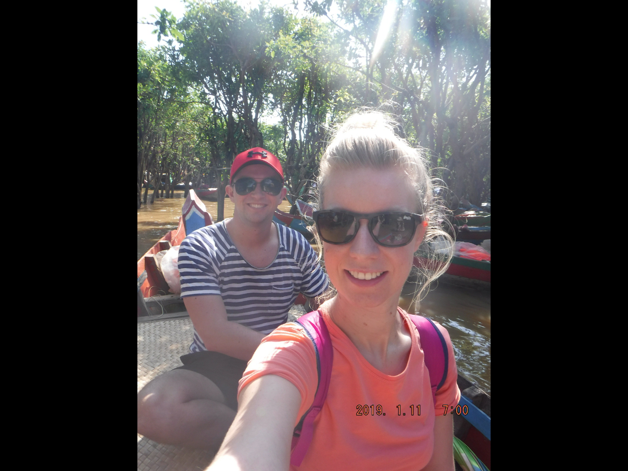 Back on the boat we had a looonngg, finally we passed a few floating shacks with signs ‘crocodile meat restaurant’ and crocodile compounds attached. We had to get off at one of these for a long boat trip through the mangroves, not only were there crocs caged but also a huge python, and a rabbit πŸ˜₯. The mangrove boat ride was nice, there were many many boats all with ladies sleeping waiting to take tourists. It lasted around 15minutes and around there were lots of underwater traps, catching probably anything that dared move! At one point we went off the ‘track’ through the mangroves and the lady picked a bunch of flowers from the trees for the women, I reluctantly took it but my first thought was all of the insects that it may hold.